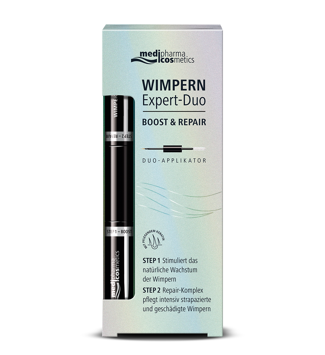 Verzagen sie nicht, wenn Ihre Wimpern spröde sind! Brüchige Wimpern retten Sie mit unserem Wimpern Expert-Duo Boost & Repair. Dieses "Wundermittel" hilft Ihnen in zwei Schritten: Sie tragen zunächst das Serum mit dem feinen Pinsel auf. Es stimuliert das natürliche Wachstum Ihrer Wimpern und sorgt dafür, dass sie nach und nach dunkler erscheinen. Zusätzliche Pflege verleihen Ihnen Olivenblatt-Extrakt, Panthenol und weitere hochwertige Wirkstoffe. Im zweiten Schritt tragen Sie mit der Bürste den Repair-Komplex auf: Pharmazeutisches Hyaluron, Keratin und Weizenproteine spenden Ihren Wimpern Feuchtigkeit. Außerdem verbessern diese Wirkstoffe die Haarstruktur und glätten sie. Ein Schutzfilm aus Biotin und Provitamin B5 kräftigt Ihre strapazierten Wimpern nachhaltig.