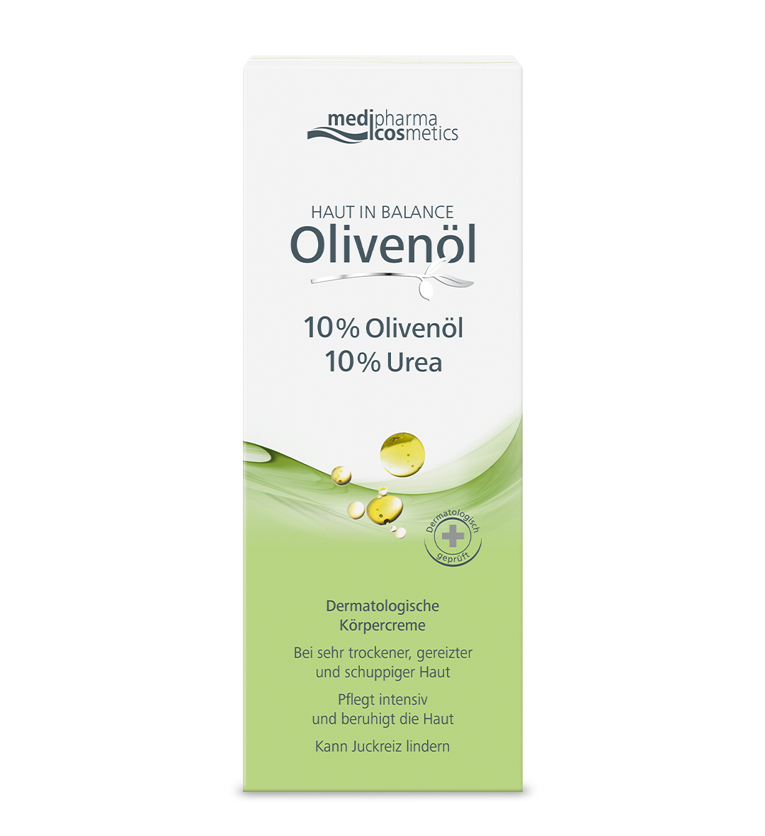 Die Dermatologische Körpercreme, mit der Wirkstoffkombination aus 10 % Olivenöl und 10 % Urea, versorgt sehr trockene, gereizte und schuppige Haut intensiv mit hautpflegenden Lipiden und Feuchtigkeit.