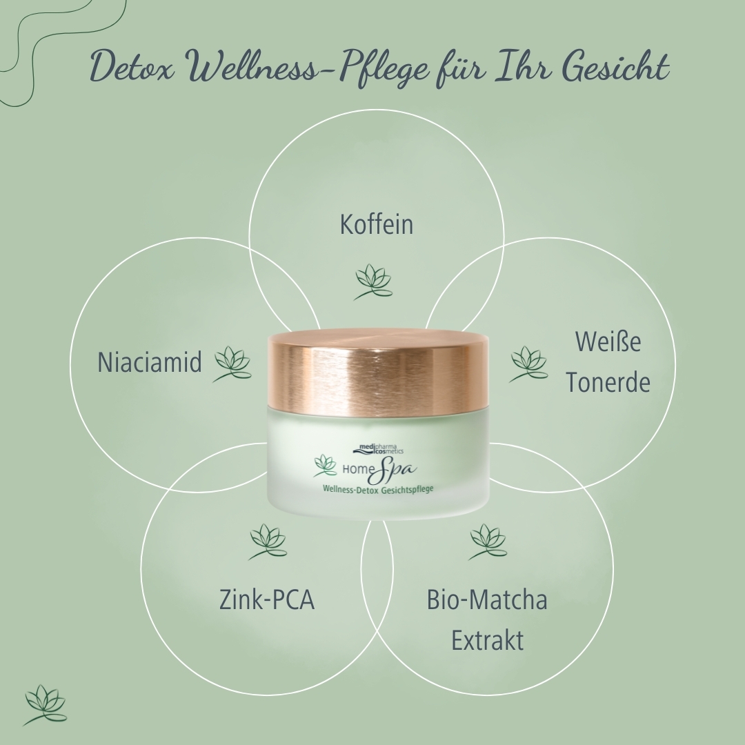 Lassen Sie den Alltag hinter sich und tauchen Sie ein in die beruhigende Atmosphäre einer grünen Oase. Inspiriert durch die Natur, schenkt die Home Spa Wellness-Detox Gesichtspflege Ihrer Haut eine wohltuende Auszeit. Die leichte, klärende Formel pflegt die Haut und verwöhnt die Sinne mit dem zarten Green Garden Duft. Dieser umhüllt die Haut sanft und entführt Sie in eine Welt voller Ruhe und natürlicher Frische – wie ein Spaziergang durch einen Garten, in dem frisches Grün und blühende Pflanzen die Luft erfüllen.
