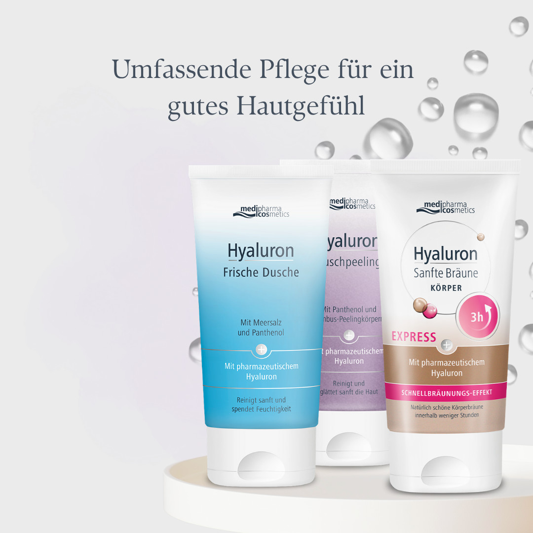 Für ein geschmeidiges, ebenmäßiges Hautgefühl ist ein regelmäßiges, sanftes Peeling ein beliebter Bestandteil der Körperpflege.Das Hyaluron Duschpeeling von medipharma cosmetics wurde entwickelt, um die Haut mild zu reinigen, sanft zu glätten undintensiv zu pflegen – ohne sie dabei auszutrocknen.Feine Peelingkörper aus Bambus lösen abgestorbene Hautzellen besonders schonend und regen die natürliche Hauterneuerungan. Die Haut fühlt sich nach der Anwendung spürbar glatter, weicher und gepflegter an. Panthenol beruhigt empfindlicheHautpartien und unterstützt die Regeneration, während pharmazeutisches Hyaluron die Haut intensiv mit Feuchtigkeit versorgt.Für ein angenehmes Pflegeerlebnis wird das Peeling ein- bis zweimal pro Woche in die feuchte Haut einmassiert undanschließend mit warmem Wasser abgespült. Die sanfte Formulierung eignet sich besonders für normale Haut und lässt sichideal in die bestehende Duschpflege integrieren.Die Hautverträglichkeit wurde dermatologisch geprüft, sodass auch empfindliche Hauttypen von der Anwendung profitierenkönnen. Perfekt für alle, die ihre Haut nicht nur reinigen, sondern gleichzeitig verwöhnen möchten.Für die tägliche Anwendung empfiehlt sich ergänzend die Hyaluron Frischedusche von medipharma cosmetics. Sie reinigt sanft,erfrischt mit belebendem Meersalz und pflegt die Haut zusätzlich mit Panthenol.Vor dem Auftragen eines Produkts der Hyaluron Sanfte Bräune-Serie kann das Peeling helfen, ein gleichmäßigeres undnatürliches Ergebnis zu erzielen.