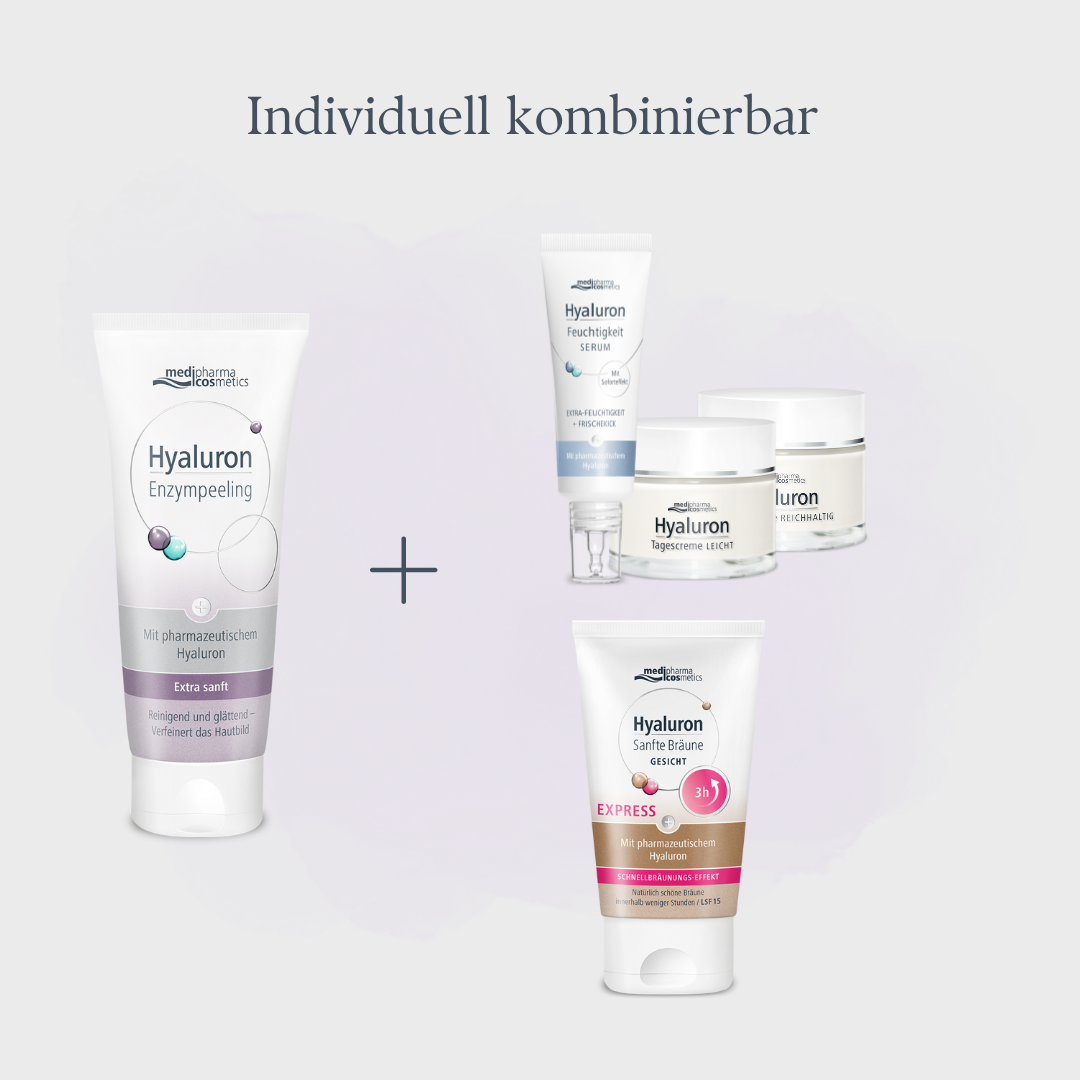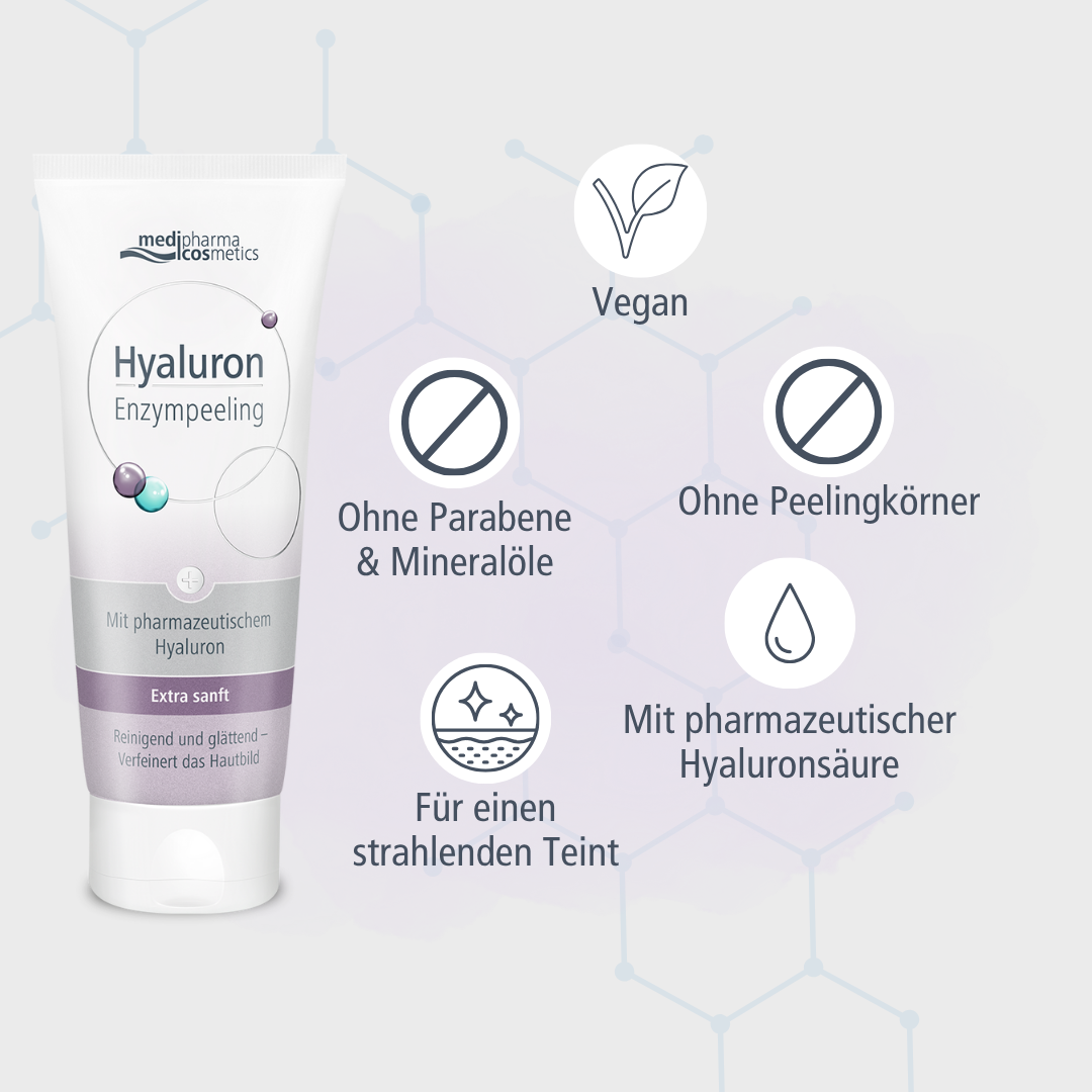 Die Haut erneuert sich etwa alle 28 Tage – ein natürlicher Prozess, bei dem regelmäßig angewendete Peelings dieHautregeneration gezielt unterstützen können.Das Hyaluron Enzympeeling von medipharma cosmetics wurde entwickelt, um die Haut sanft zu reinigen, ihr ein glatteres,strahlenderes Aussehen zu verleihen und das Hautbild zu verfeinern – ganz ohne mechanische Reibung.Die Formulierung enthält milde Enzyme, die abgestorbene Hautzellen besonders schonend lösen und so die natürlicheErneuerung der Haut unterstützen. Ergänzt wird die Wirkung durch pflegende Pflanzenextrakte aus Hibiskus, Ginseng undTsubaki-Öl. Gemeinsam mit dem pharmazeutischen Hyaluron pflegen sie die Haut, halten sie geschmeidig und verbessern dasHautgefühl.Bei regelmäßiger Anwendung wirkt der Teint frischer, ebenmäßiger und glatter, ohne die Haut zu reizen oder zu belasten – idealauch für empfindliche Hauttypen.Die Rezeptur ist vegan, frei von Parabenen und Mineralölen und wurde dermatologisch auf Hautverträglichkeit geprüft.Das Hyaluron Enzympeeling eignet sich ideal als Vorbereitung für die nachfolgende Gesichtspflege – etwa für das HyaluronFeuchtigkeit Serum oder eine der Hyaluron Gesichtscremes von medipharma cosmetics. Auch vor dem Auftragen eines Produktsder Hyaluron Sanfte Bräune-Serie kann das Peeling helfen, ein gleichmäßigeres und natürliches Ergebnis zu erzielen.