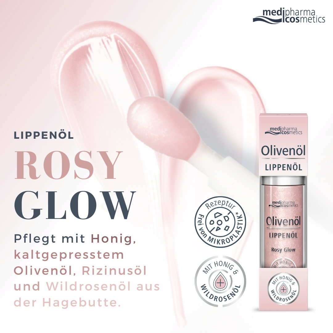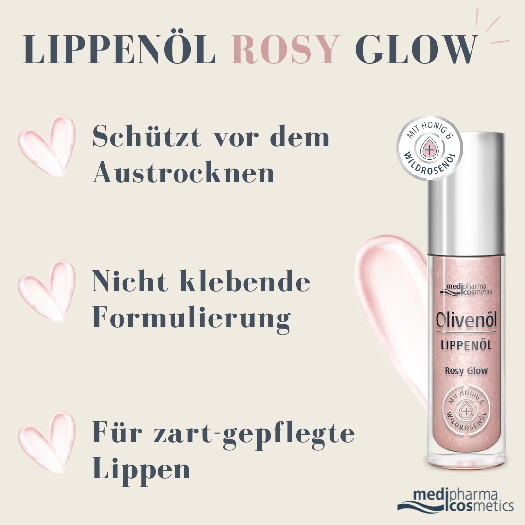 Das intensiv pflegende Olivenöl LIPPENÖL Rosy Glow schützt trockene, spröde Lippen mit Honig, kaltgepresstem Olivenöl, Rizinusöl und Wildrosenöl aus der Hagebutte.